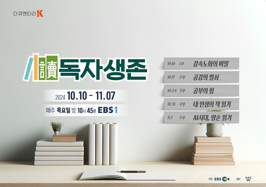 EBS 다큐멘터리 '독자생존'은 독서의 중요성을 강조하는 프로그램으로, 2024년 10월 10일부터 11월 7일까지 매주 목요일 오후 10시 45분에 EBS1에서 방영될 예정이에요. 이 다큐멘터리는 독서가 개인의 삶에 미치는 긍정적인 영향을 다양한 시각에서 조명하고 있어요.
