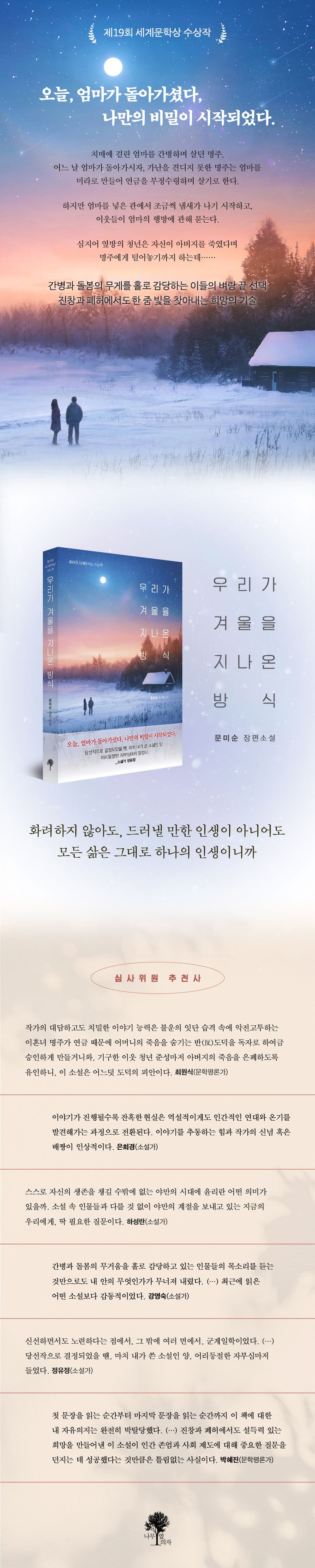 『우리가 겨울을 지나온 방식』은 문미순 작가의 최신작으로, 제19회 세계문학상을 수상한 작품이에요. 이 책은 이야기가 불가능한 곳에서 새로운 이야기를 만들어내고, 삶의 가능성이 소진된 곳에서 한 줌의 빛을 찾아내는 과정을 그려내고 있어요. 독자들은 이 책을 통해 겨울의 차가움 속에서도 따뜻한 인간애를 느낄 수 있을 거예요.